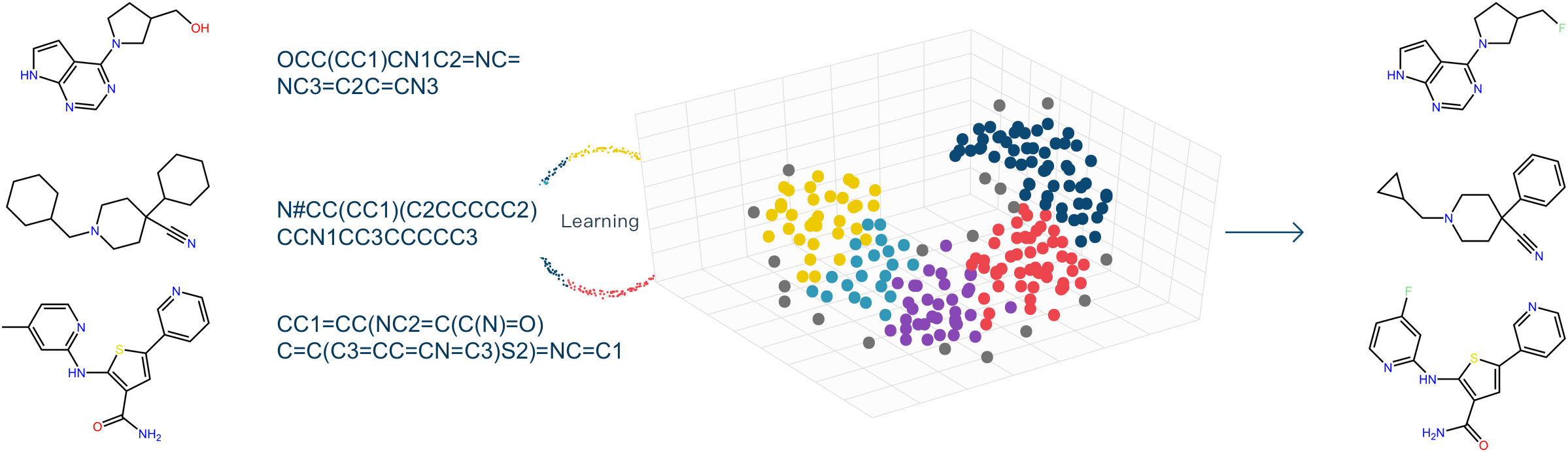 运用AI算法根据蛋白口袋形状和性质要求,基于骨架跃迁、侧链替换、电子等排等策略,让计算机自动生成目标化合物库,库中的新分子具有良好的类药性和可合成性。
